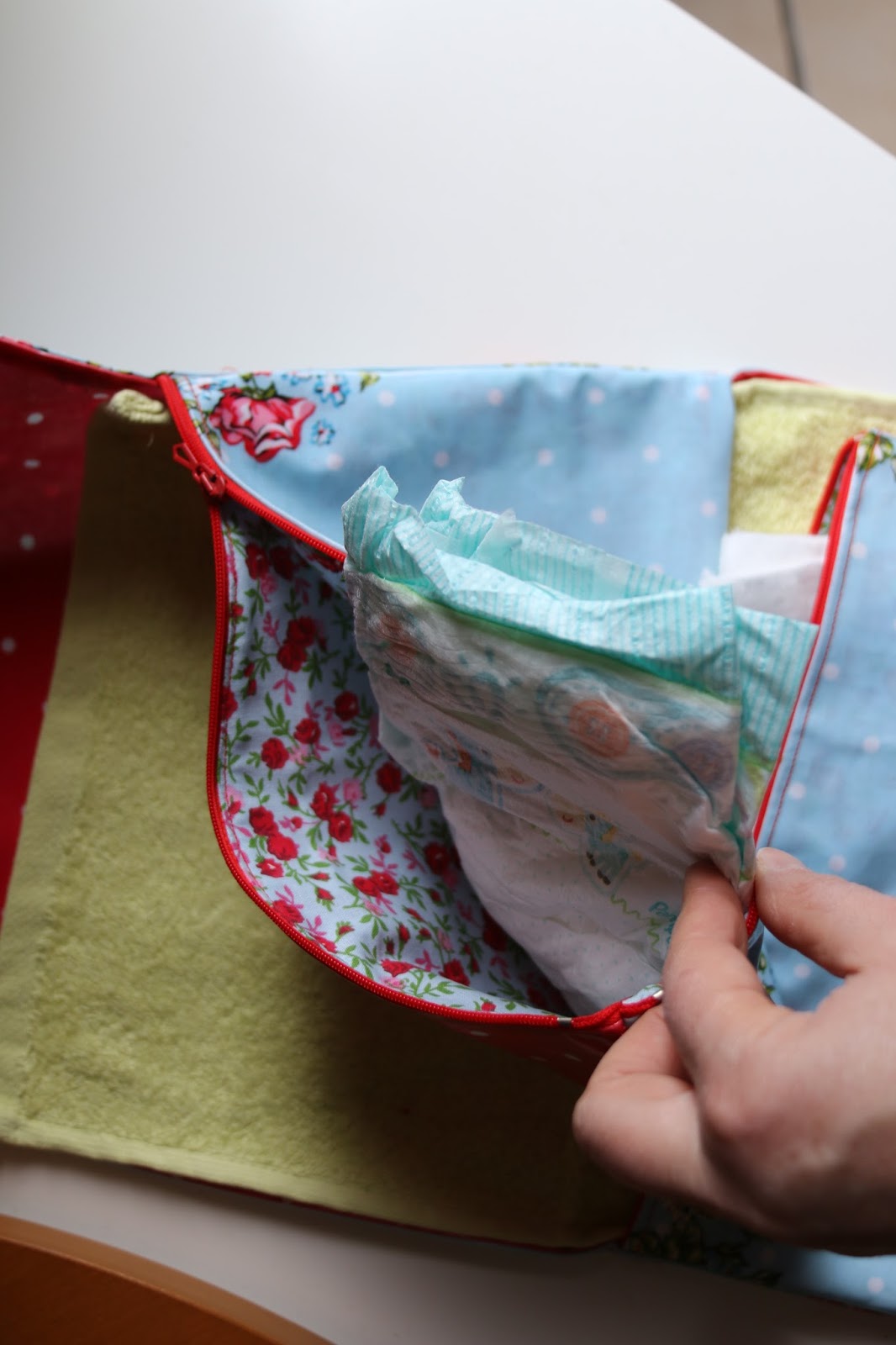 Le principe est de pouvoir glisser quelques couches et quelques cotons dans les 2 pochettes à fermeture éclair prévues pour ça, et de changer la couche de son bébé à peu près n'importe où! Hyper pratique!